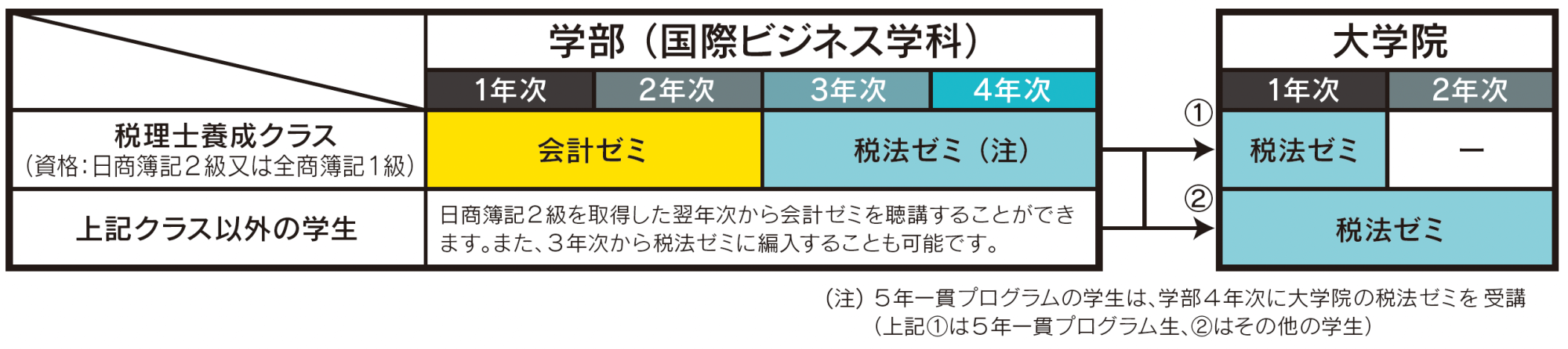 さらに後半の2年間と大学院の1年間において、税法1科目(所得税法、法人税法、相続税法等)の合格、そして大学院で税法修士論文を完成させることにより国税審議会から税法2科目の試験免除の認定を受けることを目標とします。