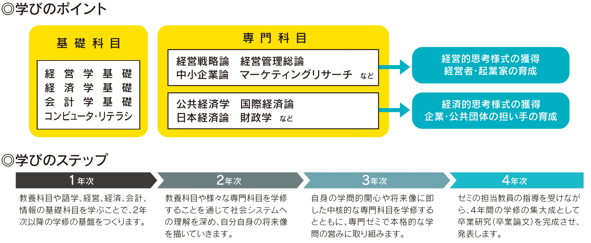 企業活動や地域活動の担い手として活躍するために、経営・経済・情報の学問領域を中心として幅広く学修します。