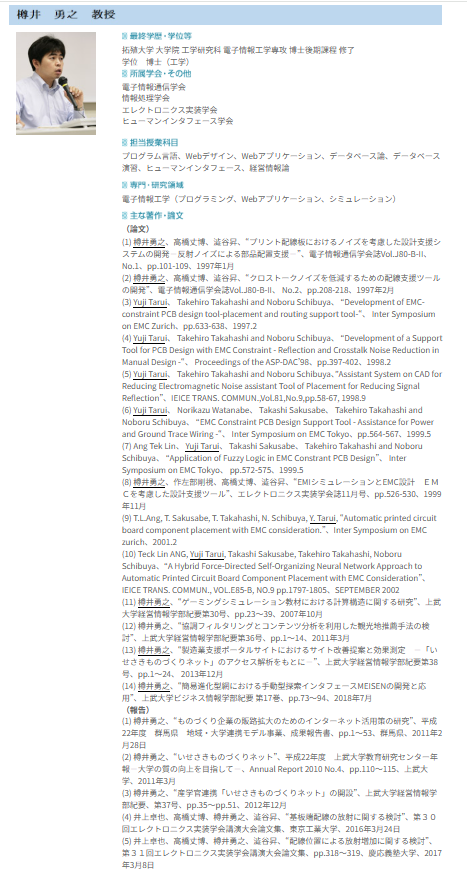 | 樽井 勇之 | 教授 | プログラム言語、Webアプリケーション等 |