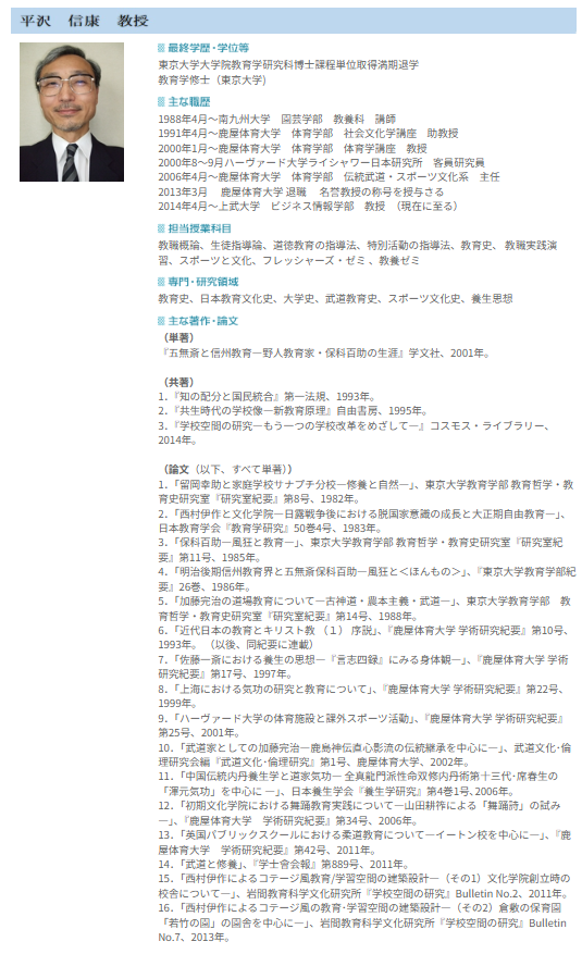 | 平沢 信康 | 教授 | 教職概論、教育史、生徒指導論等 |