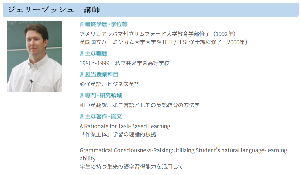 | ジュエリーブッシュ | 講師 | 必修英語、ビジネス英語 |