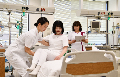 医療現場と同様の設備が整った演習室で、患者シミュレーターを使用した看護技術の演習が行われます。