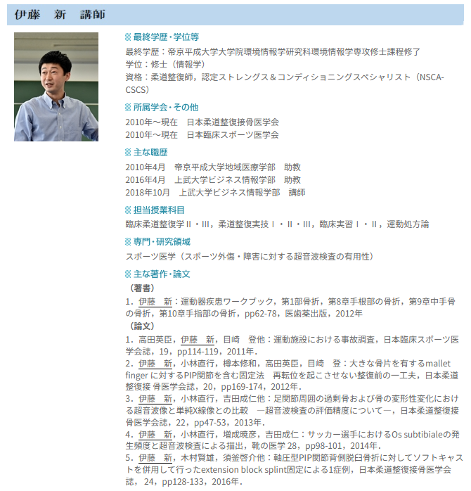 | 伊藤 新 | 准教授 | 柔道整復実技Ⅰ(包帯)、柔道整復実技Ⅱ(上肢①)、Ⅲ(上肢②) |