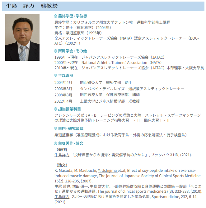 | 牛島 詳力 | 准教授 | テーピングの理論と実際等 |