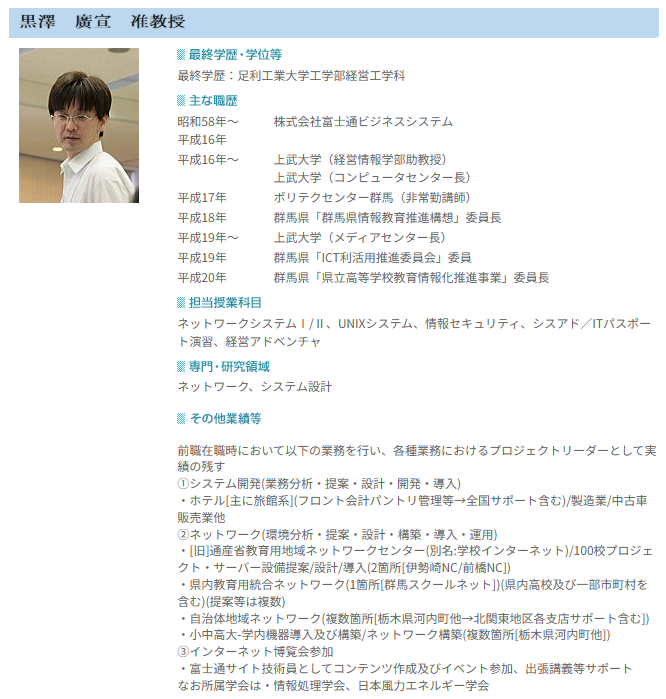 | 黒澤 廣宣 | 准教授 | コンピュータリテラシA、B等 |