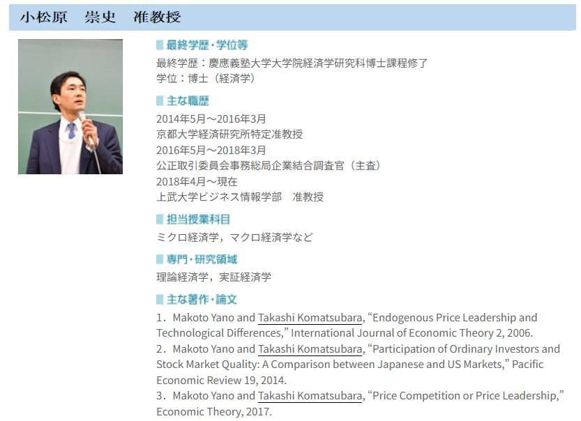 | 小松原 崇史 | 准教授 | マクロ経済学、ミクロ経済学等 |