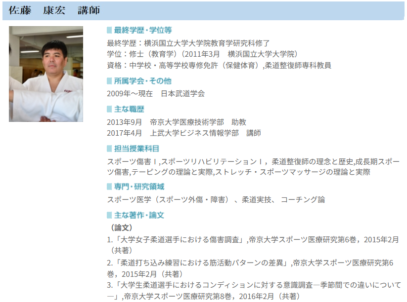 | 佐藤 康宏 | 講師 | 柔道整復の理念と歴史、テーピングの理論と実際等 |