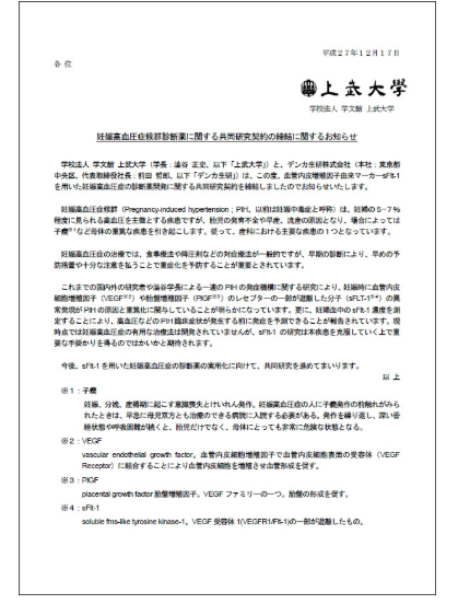 12月17日(木)、群馬県庁内刀水クラブで 澁谷正史研究所長とデンカ生研株式会社との妊娠高血圧症候群の診断薬開発に関する共同研究契約締結について記者発表を行いました。
