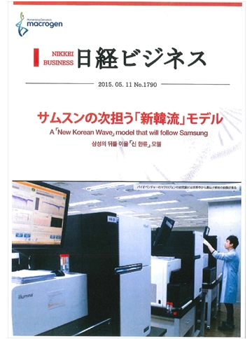澁谷正史研究所長は、本年7月3日に韓国ソウル大学・Jeong-Sun Seo教授の退官記念シンポジウムに招待され、「日韓がん会議の設立、および、最近の研究の話題」と題して講演を行いました。Seo教授は韓国のゲノム研究で世界的に有名なベンチャー企業・Macrogenを創設した研究者です。下の図は、2015年に経済誌・日経ビジネスに掲載されたMacrogenの紹介記事です。