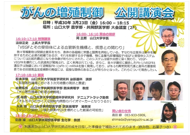 本年3月23日、澁谷正史・医学生理学研究所長は山口大学共同獣医学部・島田教授の招きにより、「がんの増殖制御」公開講演会で「VEGFとその受容体による血管新生機構と、疾患とのかかわり」と題して特別講演を行いました。