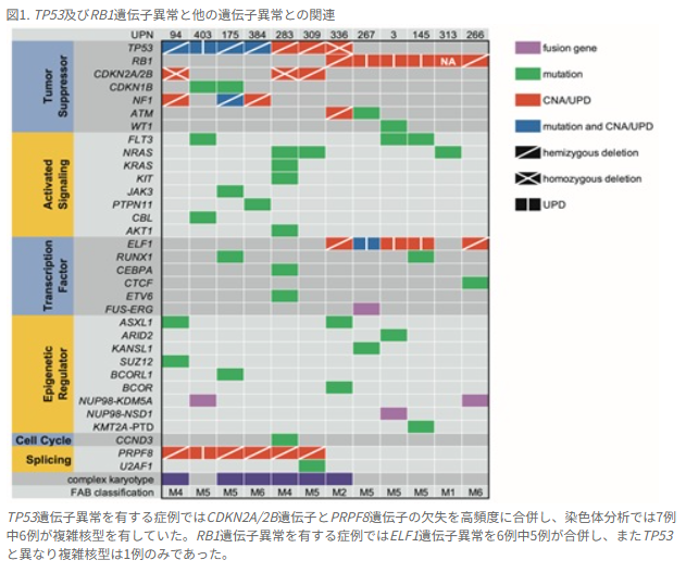 日本小児白血病リンパ腫研究グループAML-05臨床試験に登録された328症例を対象にサンガーシーケンス法と次世代シーケンサーを用い、癌関連遺伝子の網羅的な解析を行った。TP53及びRB1遺伝子異常はそれぞれ2.1%、1.8%の症例で検出された。いずれかの遺伝子異常を有する症例の予後は統計学的に有意に予後不良であった。また、これらの遺伝子異常を有する症例ではSLC2A5、KCNAB2、及びCD300F遺伝子が高発現しており、これらの遺伝子が高発現している症例はTP53とRB1遺伝子異常の有無に関わらず予後不良であった。本研究で得た知見がAMLの治療成績向上に寄与することが期待される。