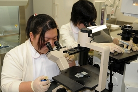 医学生理学研究所では学生の長期休暇中にアシスタントを募集し、実験を体験してもらう機会を設けていますが、3月25日からは看護学部1年生の荒井有紀乃さんと伊藤七海さんの2人が参加し、がん細胞の培養などの実験を行っています。「以前から興味があり参加したいと思っていました。がん細胞を見る機会などめったにないのでとても貴重な体験をさせてもらっています。看護学部の勉強の刺激にもなりますね。」と荒井さんが話してくれました。今回の体験は約10日間行われる予定です。