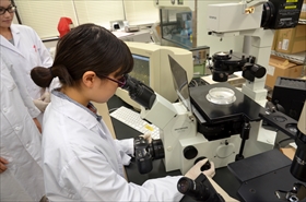 看護学部1年生の毒島桃子さんと大山真斗加さんが夏休みを利用し、医学生理学研究所で実験を体験しました。澁谷研究所長、研究所スタッフ指導のもと、がん細胞の培養と遺伝子の発現調査など、本格的な作業のアシスタントを体験しました。