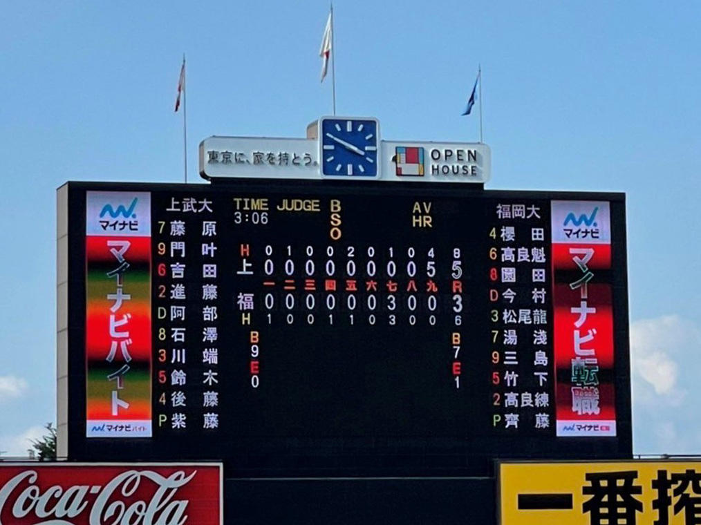 6/9明治神宮球場で行われた第三試合・対福岡大学戦で本学硬式野球部が5-3で勝利を収めました。