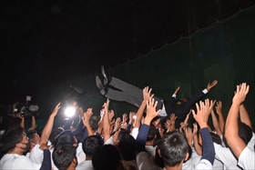 (仲間からの胴上げの祝福を受けるブライトさん)
