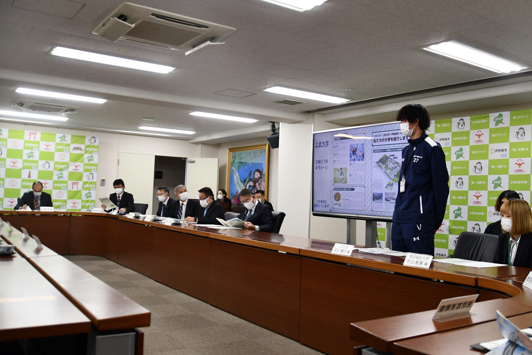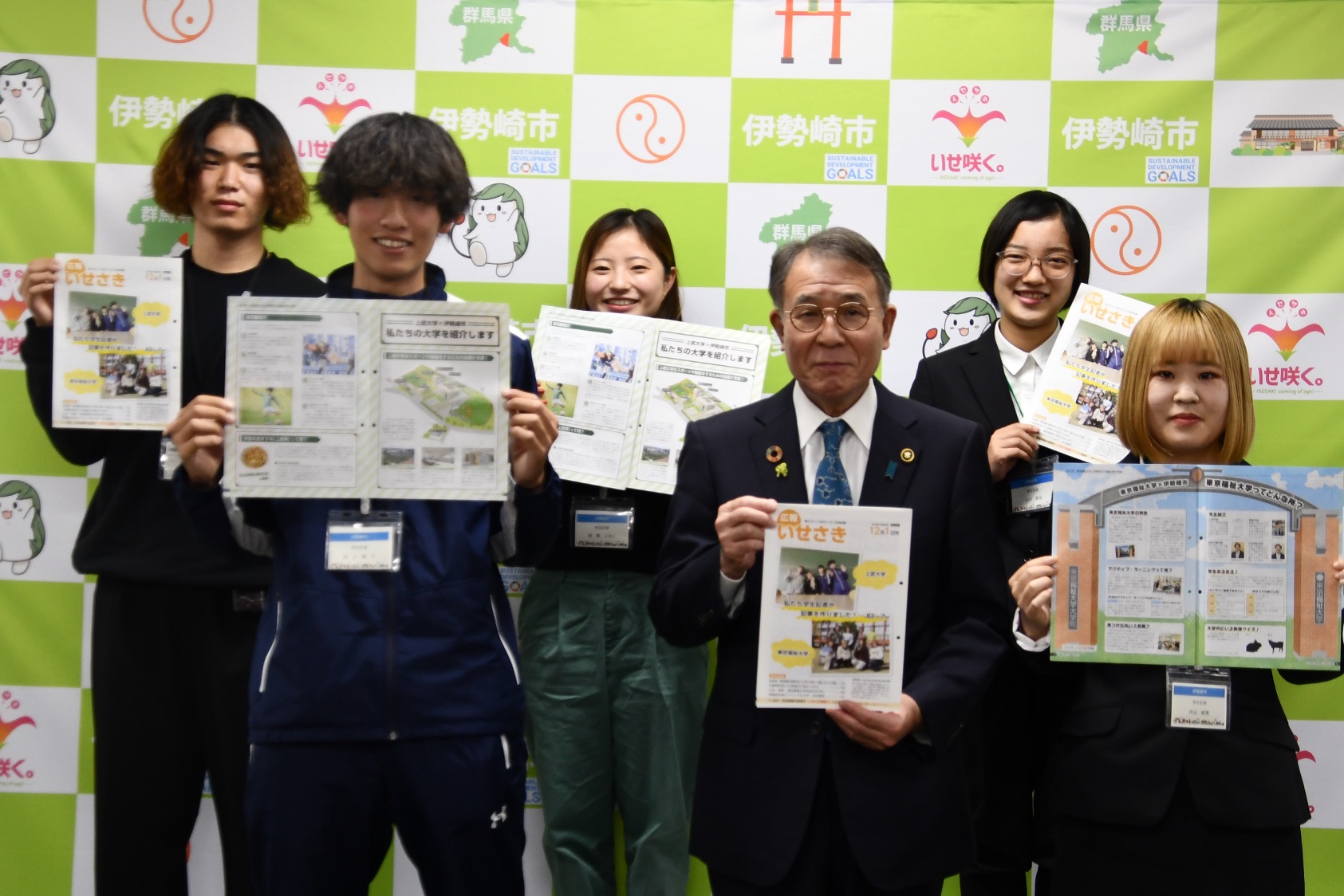 本日12/1(木).本学ビジネス情報学部の学生と、同じく伊勢崎市にキャンパスを構える東京福祉大学の学生が学生記者として、「広報いせさき(12月1日号)」にコラボレーション企画記事を出稿したことを伊勢崎市役所の定例記者会見で発表しました。掲載記事には大学紹介や、学生の行きつけの飲食店などが取り上げられ、「若い人たちにも伊勢崎の魅力を伝えたい」と本学代表学生の井上さんが会見場で制作時の思いを伝えました。これについて、臂(ひじ)伊勢崎市長は、「若い学生たちは市の財産であり、これからの伊勢崎をもっと盛り上げていくため、引き続き企画を継続していきたい」と今後の期待を語りました。