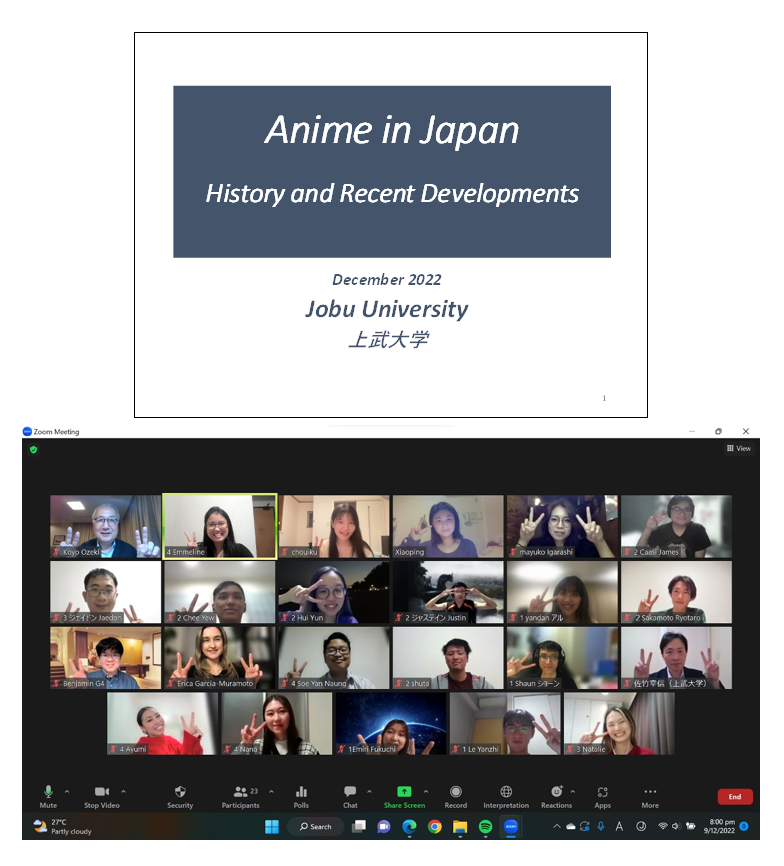 12月9日、上武大学とNTU日本愛好会との国際交流イベントがオンラインで開催されました。昨年から始まった交流会は、今回で通算6回目となります。両大学からそれぞれ12名が参加し、まずNTUからシンガポールの食文化について、上武大学から日本のアニメ文化についてプレゼンテーションを行った後、スモールグループに分かれて懇談をしました。お互いに英語と日本語の練習を兼ねて会話をし、約1時間半のイベントは楽しい雰囲気のなかで終了しました。NTUの学生さん達とは、今後もお互いの文化の紹介や絵手紙の交換など、さまざまな交流を続けて行く予定です。