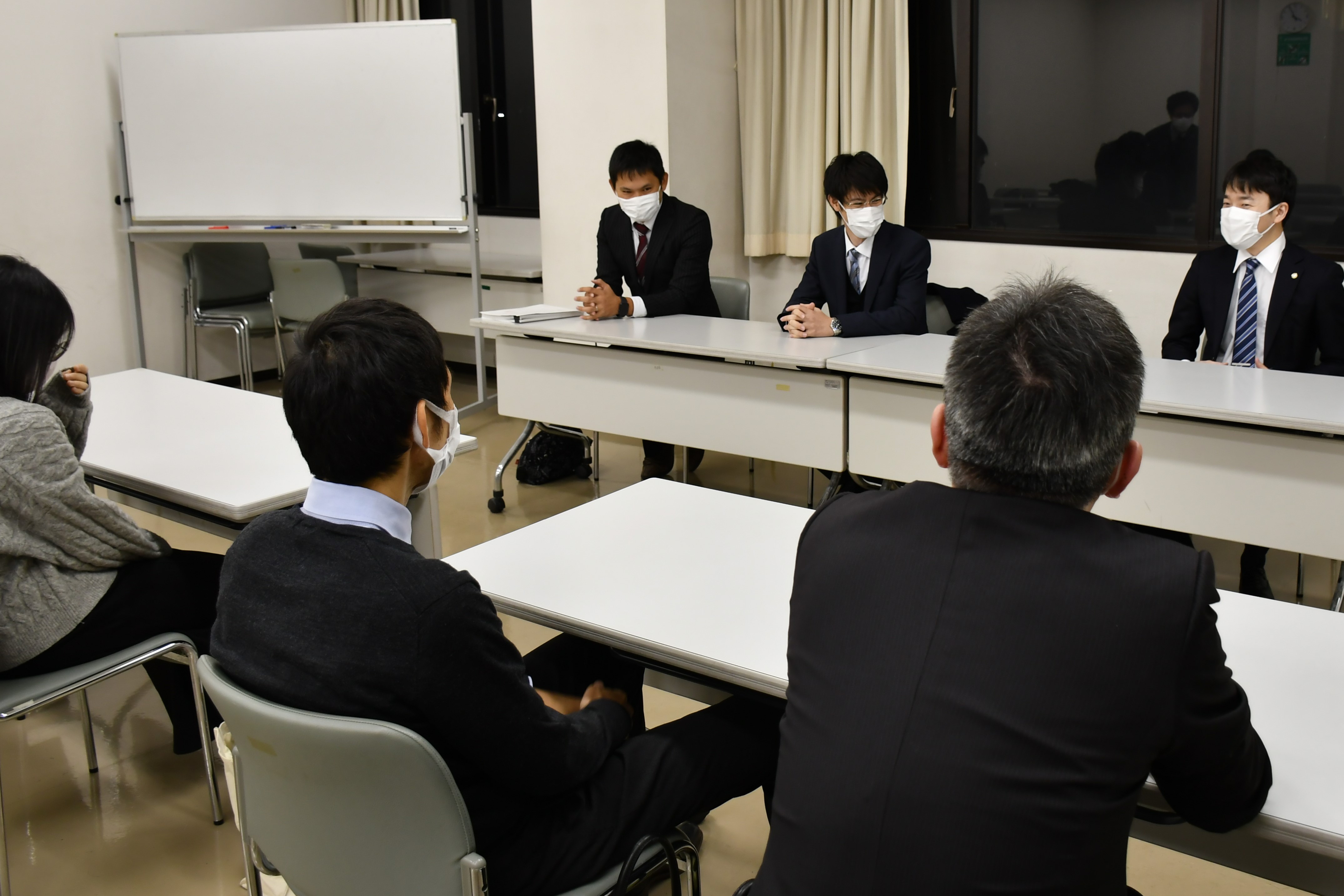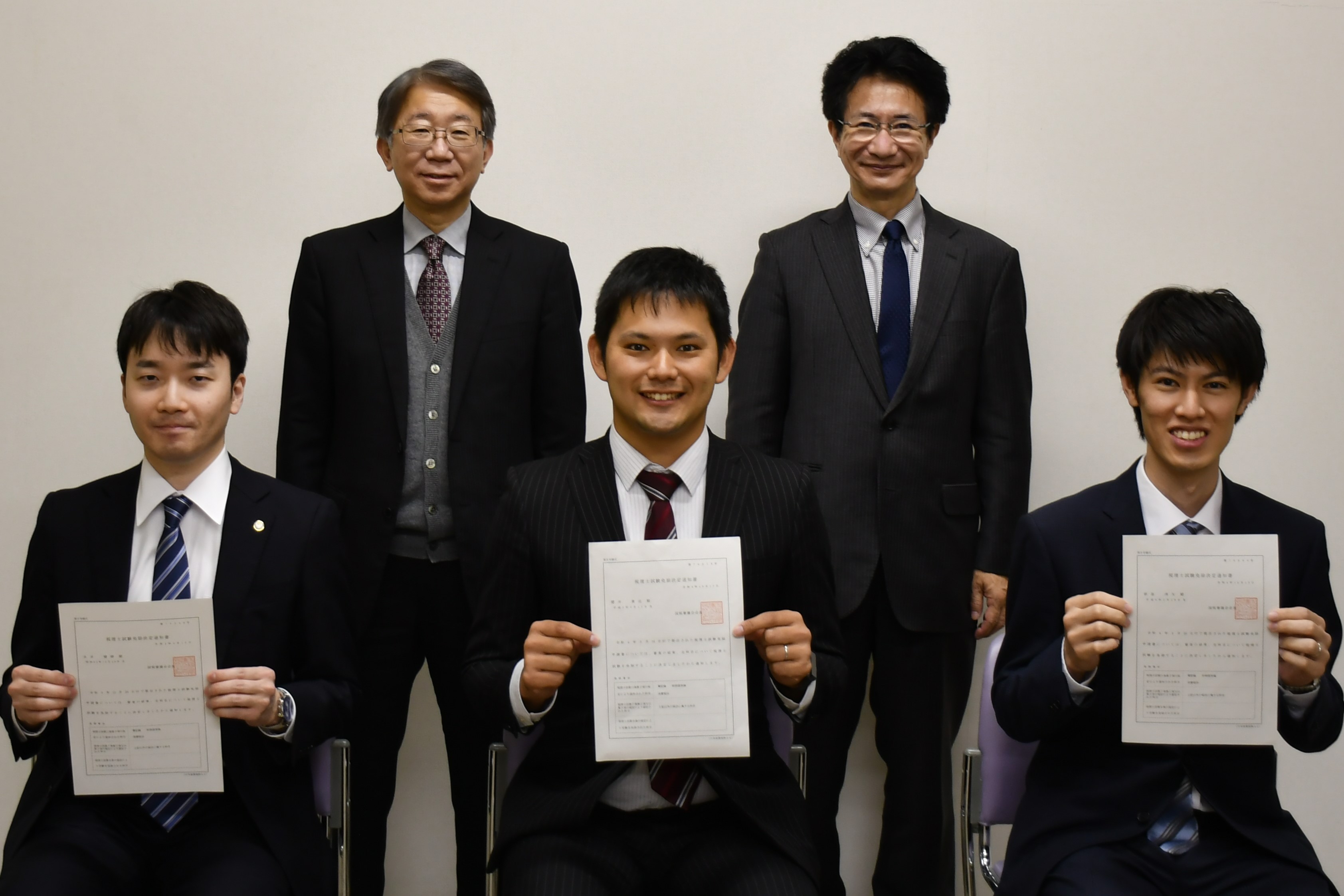 本学大学院を修了した4名が、本年、国税審議会から税理士試験免除決定通知書を受領し、そのうち3名が11月9日(水)に指導教官である田地野教授と主査の佐々木教授のもとへ訪れました。来校いただいた修了生は在学時の思い出話に花を咲かせ、記念撮影等も行われました。この日は併せて在学院生の交流会も開かれ、後輩たちに有意義なアドバイスなどが惜しげなく披露されていました。