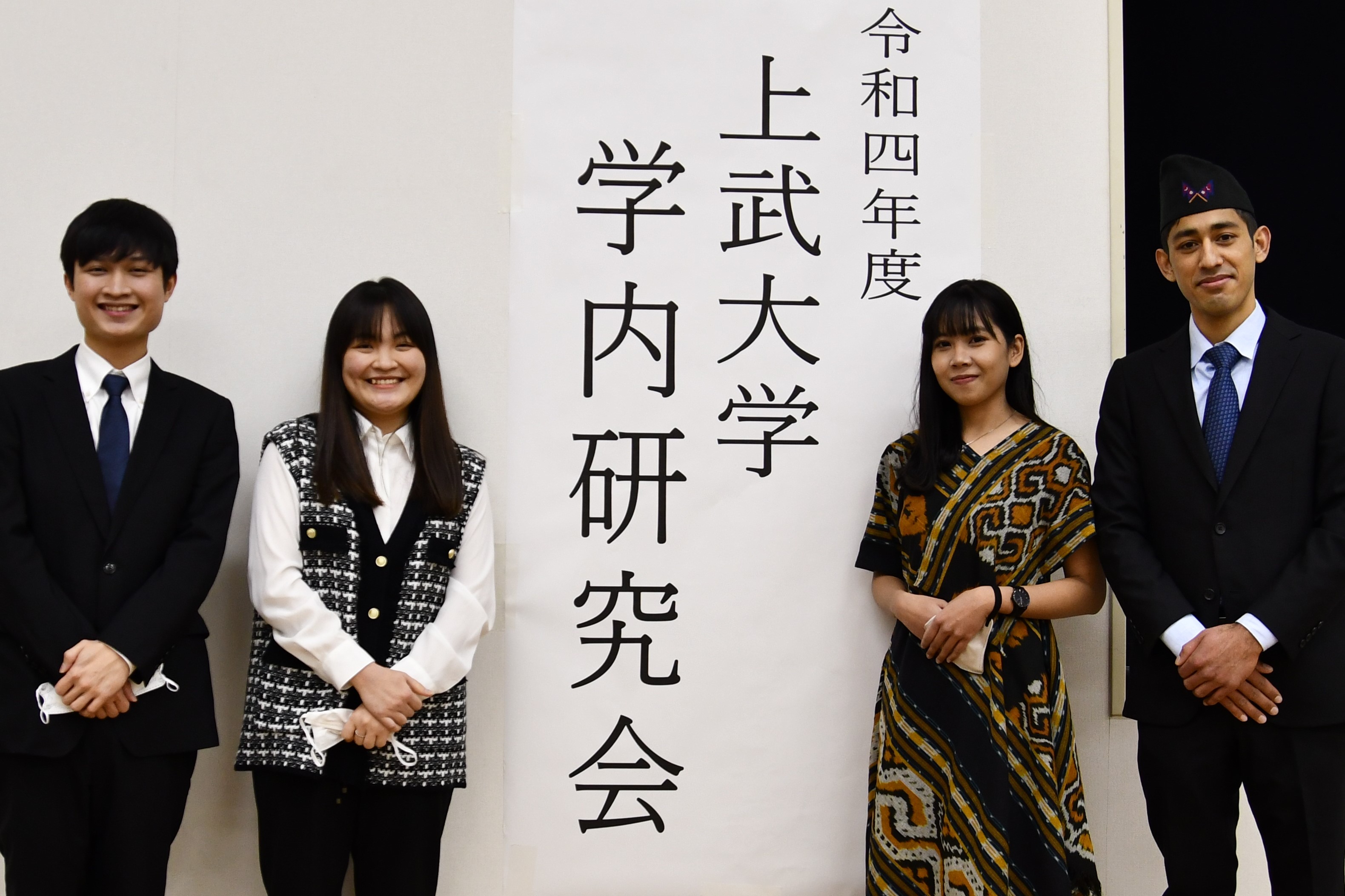 学内の教育と研究の質向上を目的とした「学内研究会」が、2月27日(月)に高崎キャンパスで開催されました。本研究会は2部構成となっており、第1部の教員報告ではビジネス情報学部から中村学部長と佐竹講師、医学生理学研究所からは、澁谷所長、林副所長、笹川研究員が研究報告を行いました。第2部は学生報告として本学院生が修士論文を、学部生が卒業研究、研修事業、地域連携・貢献事例の発表、留学生によるスピーチイベントが行われました。会場の観覧者や参加者からは質問や意見、アドバイス、感想等が盛んに発せられ、教育および研究活動の活性化に寄与する研究会となりました。