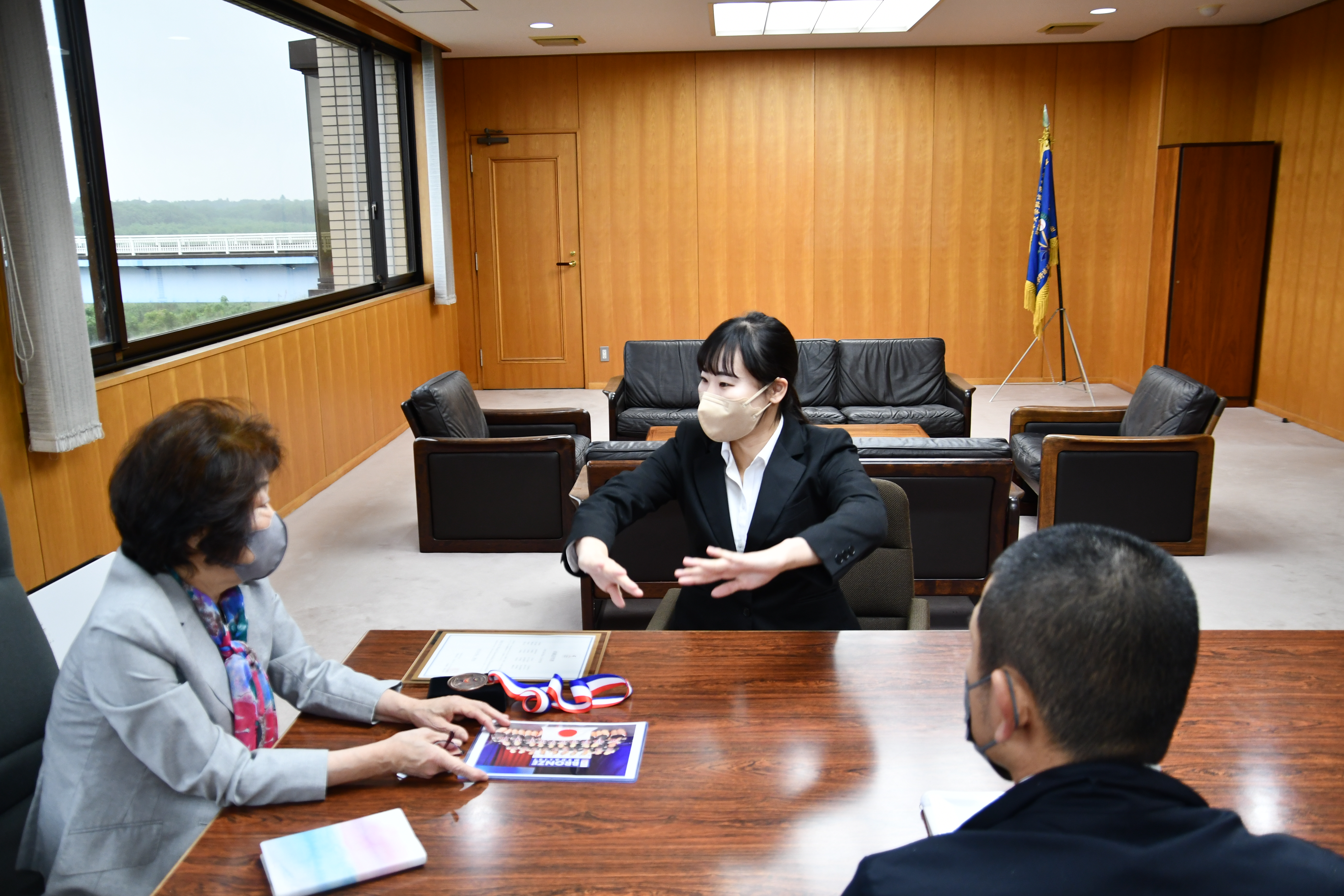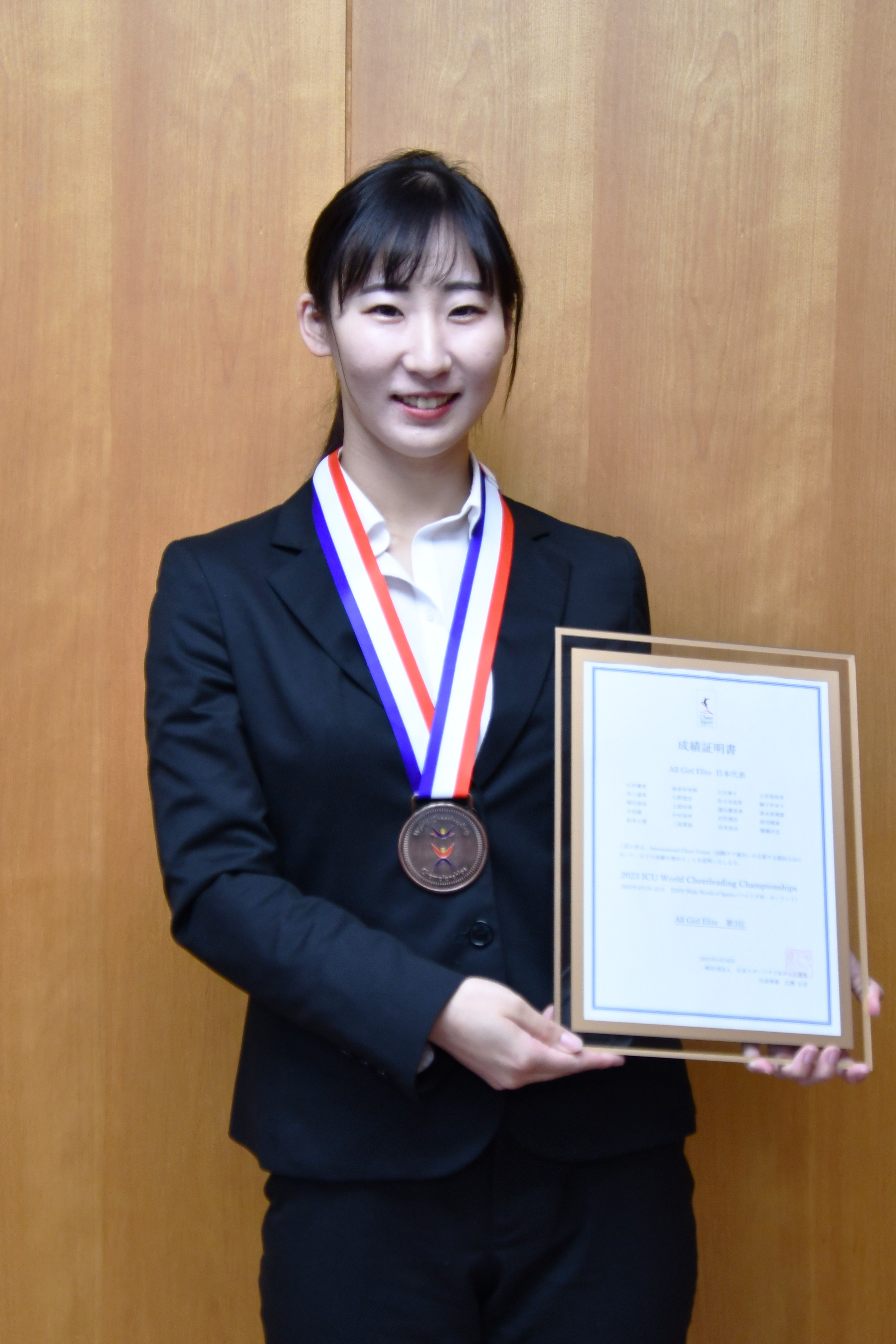 先月、アメリカ・フロリダ州で行われた「ICU世界チアリーディング選手権大会」にAll Girl Elite(オール・ガール・エリート)個人選抜日本代表として出場した本学ビジネス情報学部4年でチアリーディング部の中村泉咲さんがチームで3位入賞、銅メダルを獲得しました。そして本日5/15に世界大会銅メダル獲得に係る凱旋報告を本学の澁谷理事長に行いました。報告に際し、中村さんは「チアリーディングの本場アメリカで、1万人を超える観衆の中でのパフォーマンスはとても緊張しましたが、ICU世界チアリーディング選手権大会で日本勢として初めてメダルを獲得できてとても嬉しいです。アメリカでのチアリーディングの人気ぶりと関心の高さを改めて感じました」と本場の大舞台での感想を話しました。