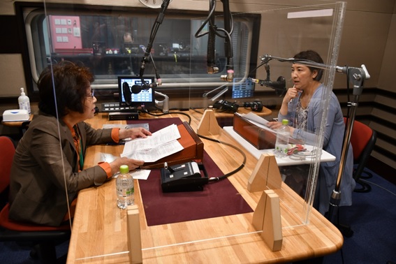 NHKのスタジオにて収録打ち合わせ(左:澁谷理事長、右:担当の関根香里アナウンサー)
