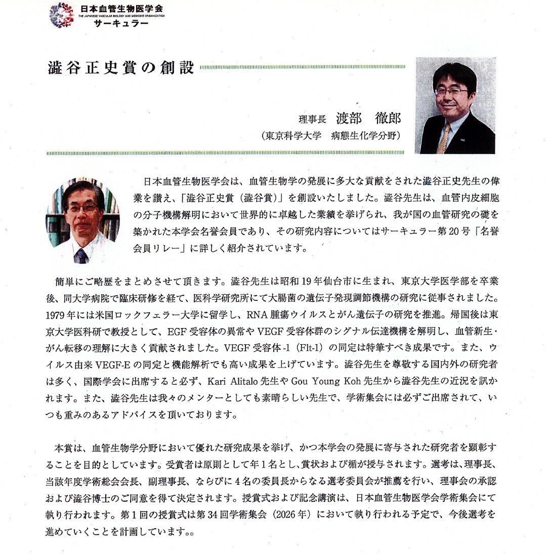 日本血管生物医学会は、本学学長の澁谷正史博士が世界の血管生物医学において長年優れた研究を行い、高い貢献度を示すことから、本年度より「澁谷正史賞」を設置することを決定しました。毎年、1名の受賞者が選ばれます。