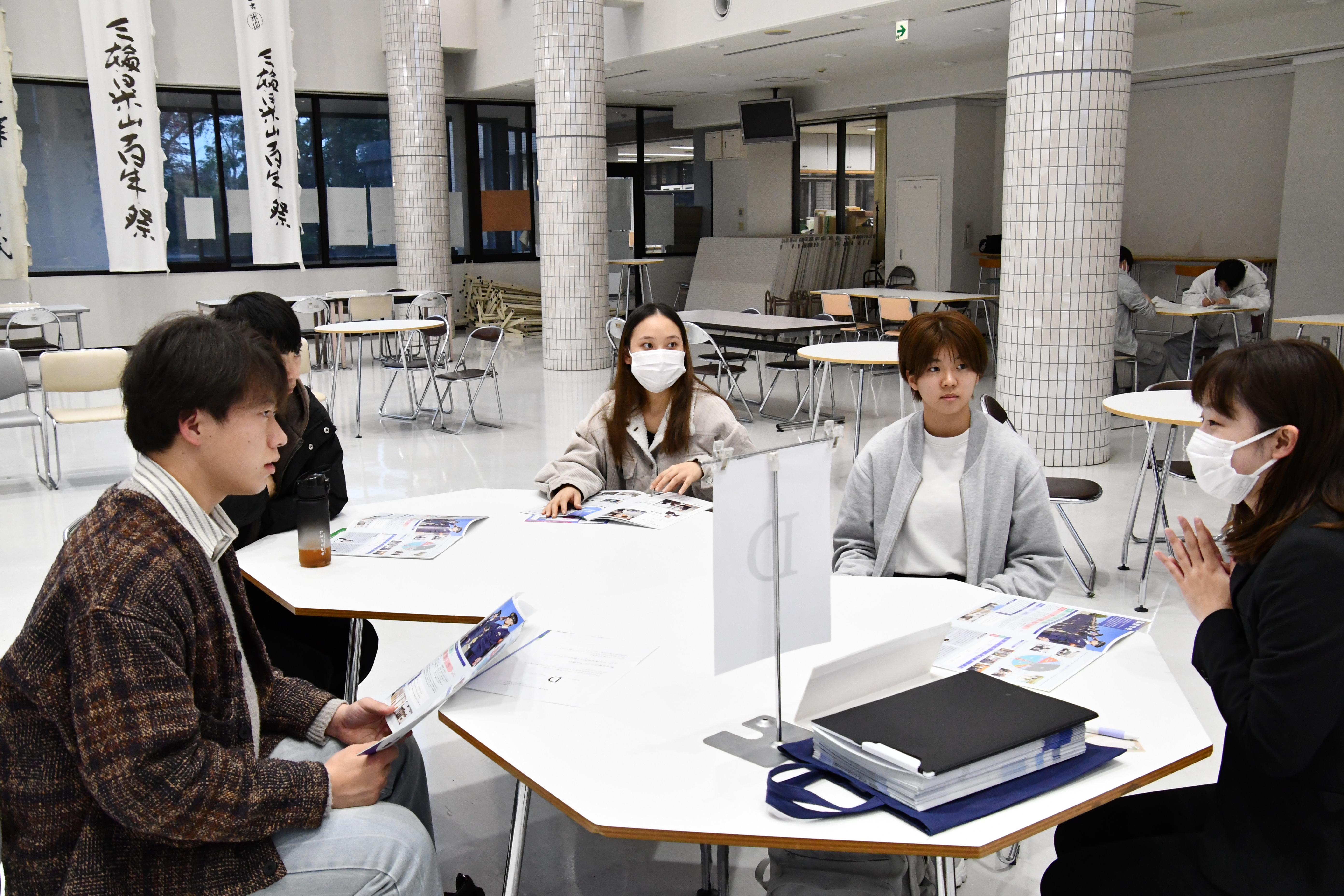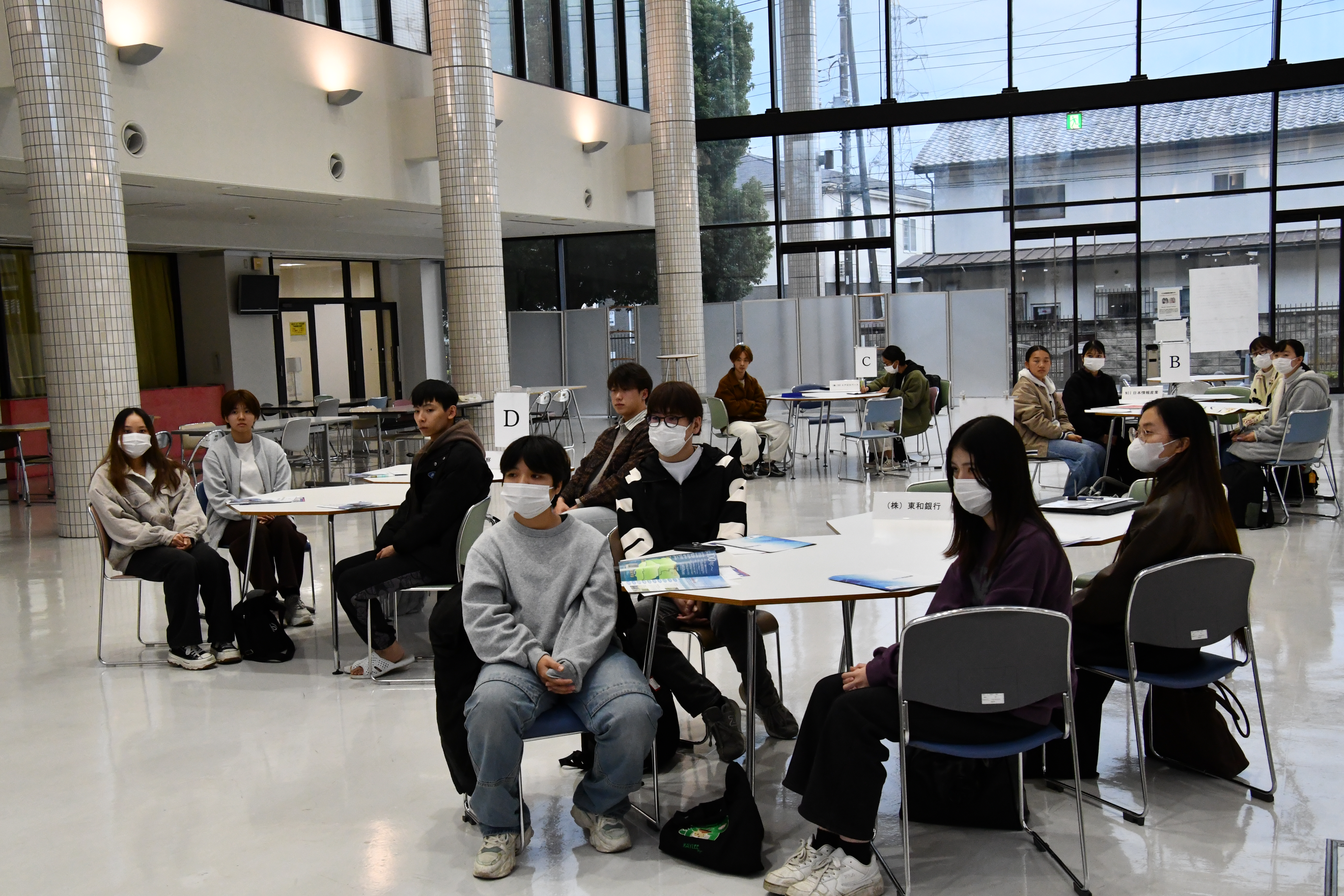 県内の優良企業4社(金融・情報通信・製造・公務の4業界)がブースを出展し、国際ビジネス学科の学生が入れ替わりながら参加しました。学生たちは真剣な眼差しで採用担当者の説明に耳を傾け、熱心に質問を投げかける姿も見られました。