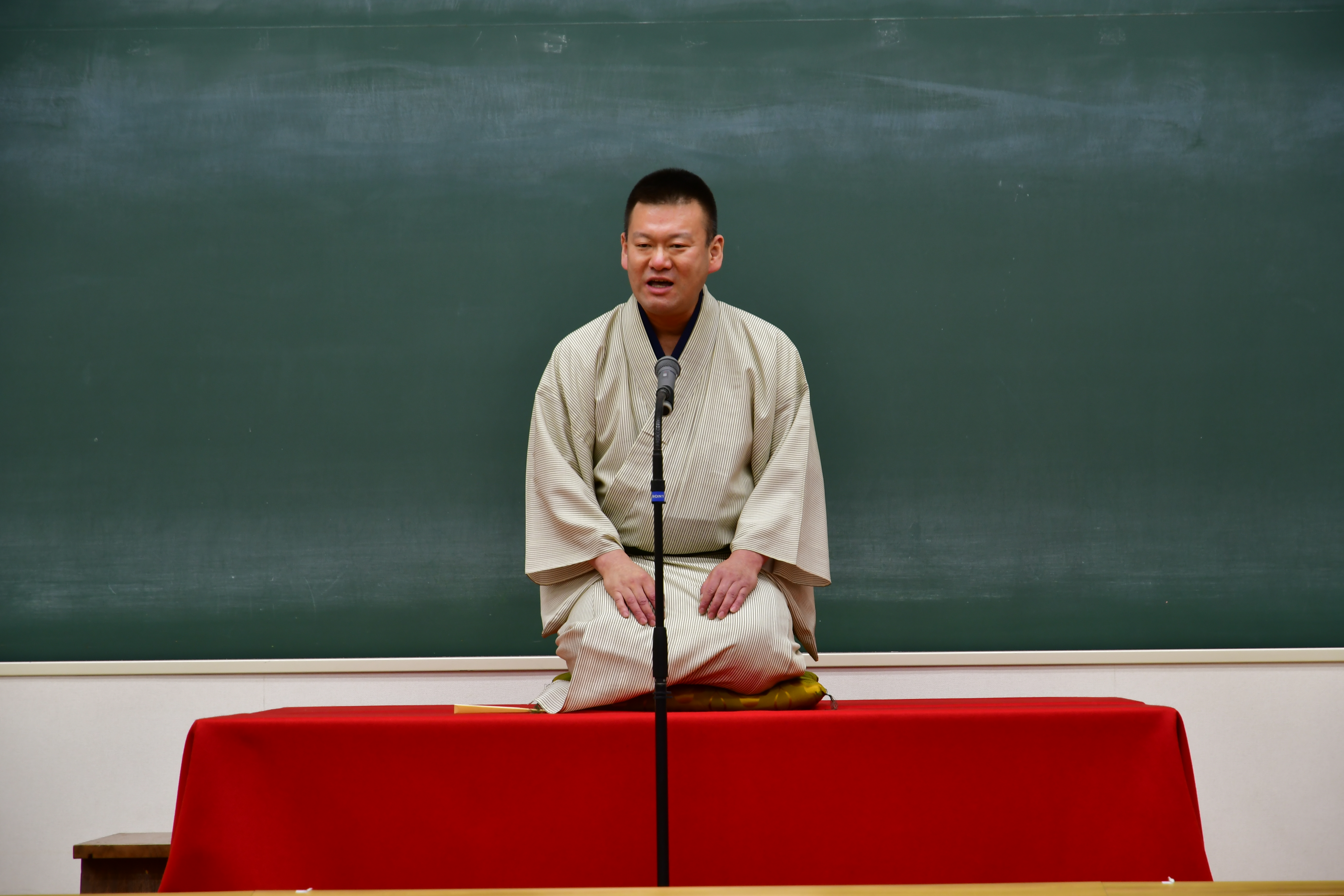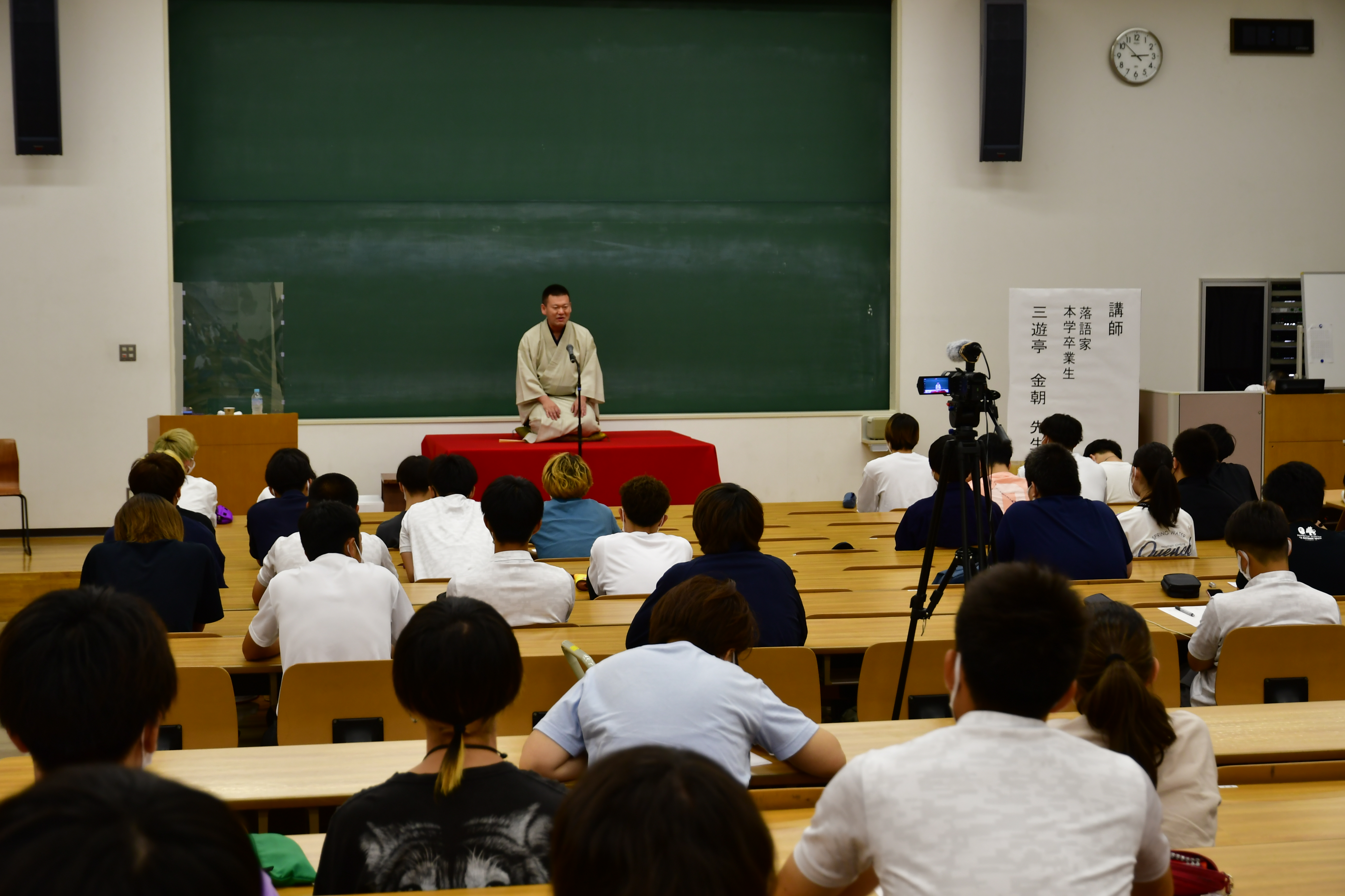 1998年に本学を卒業された落語家の三遊亭金朝師匠に、7月7日、トップマネジメント講話の講師を務めていただきました。国際ビジネス学科の2年生105名は、初めて聞く古典落語の演目『淀五郎』に感動するとともに、師匠の人生観に基づくお話を興味深く拝聴しました。その後、「落語初心者にお勧めの演目」や「落語家になろうと思った経緯」などについての質疑応答が行われ、講演は幕を下ろしました。